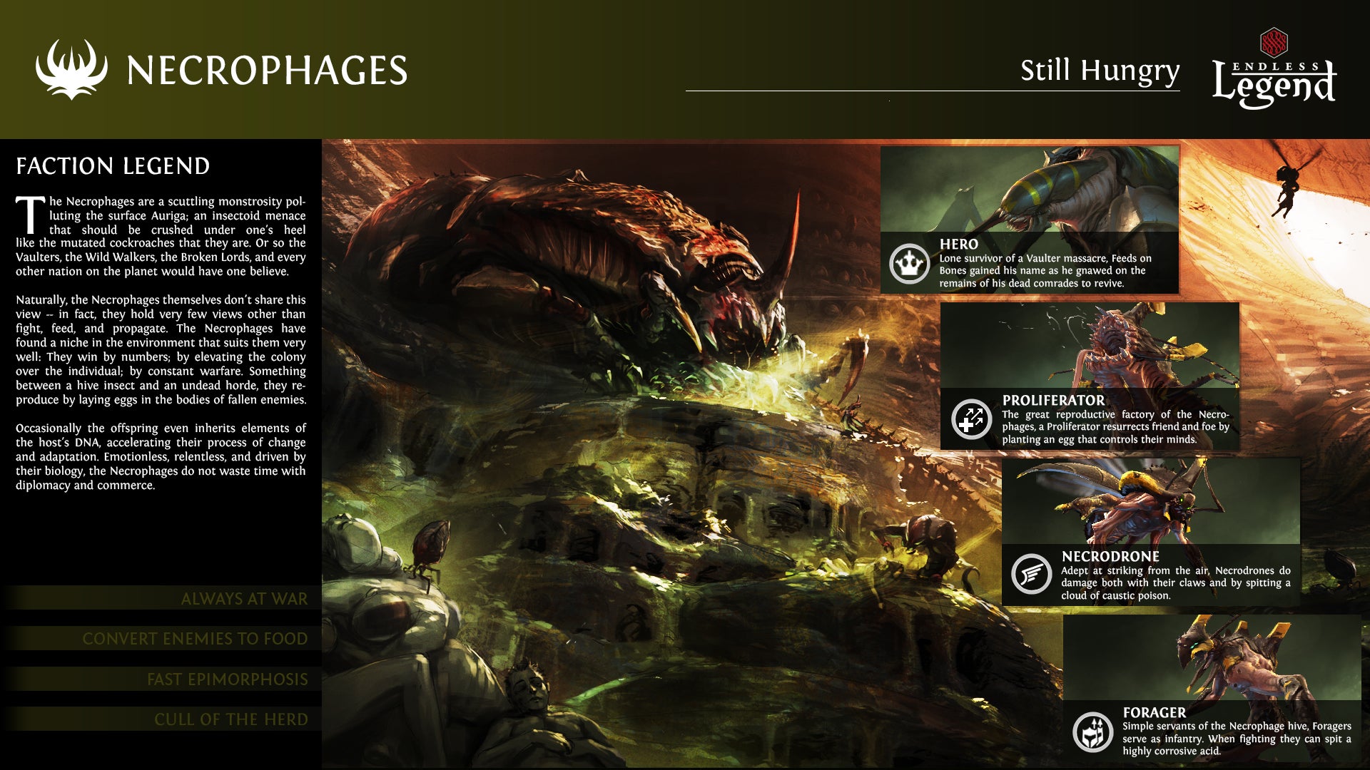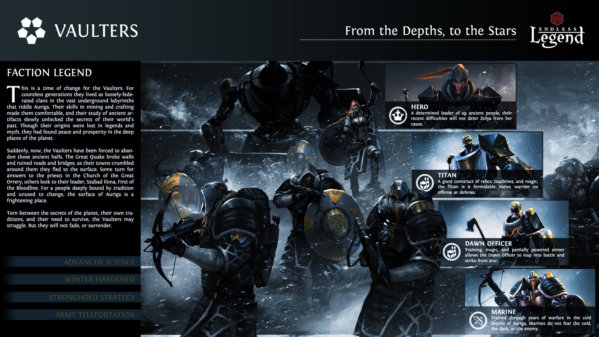 • Eight fantastic, unconventional factions – including the Vaulters, Broken Lords, and the Wild Walkers – create a distinct take on the over-used ‘Tolkien-esque stereotypes.’ For the Alpha build, players can select three out of the eight factions and advance through the use of weaponry, technology, and other “Endless” elements, such as the Dust as per Endless Space.