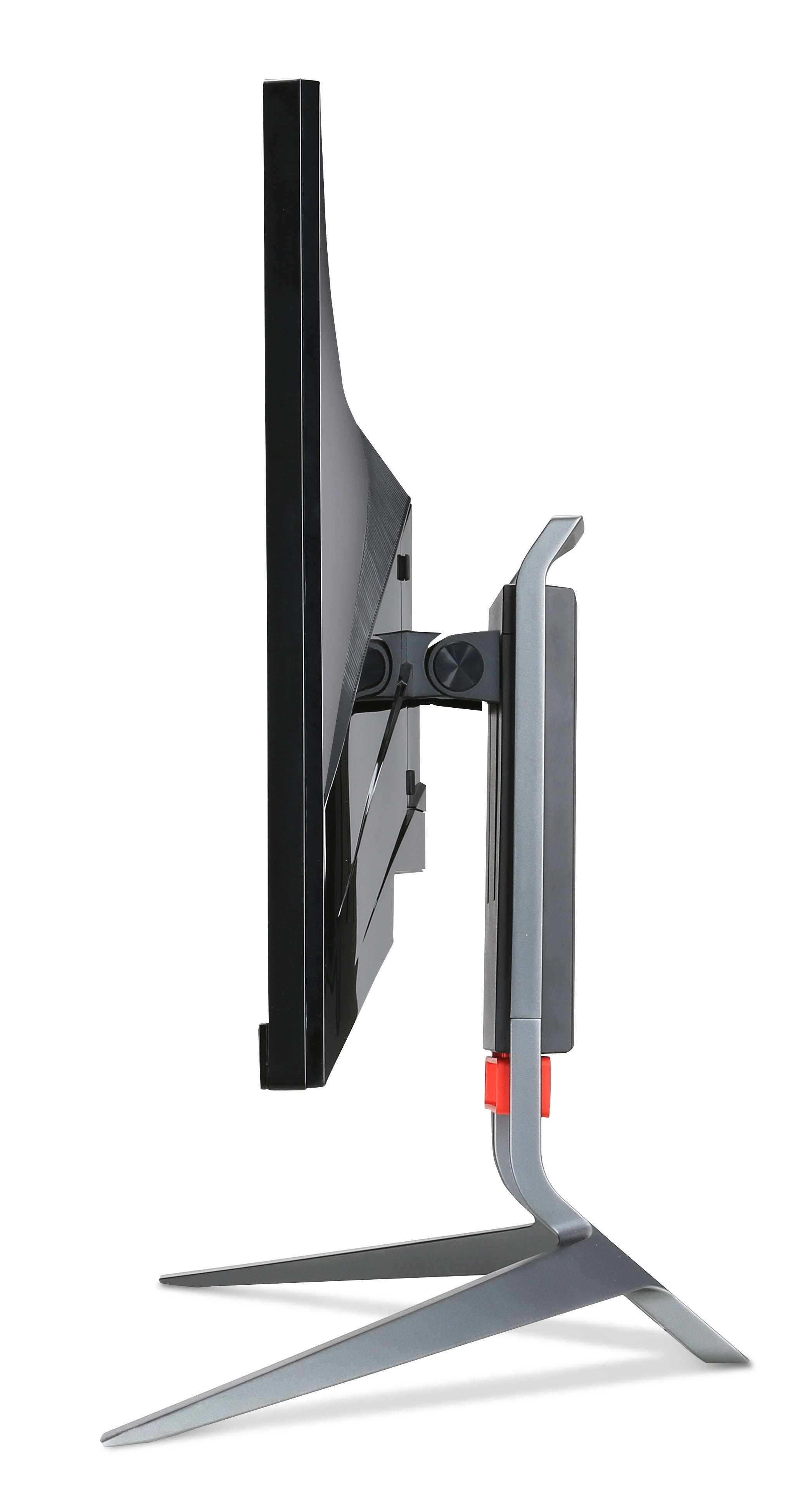 Aggressive styling sports sharp linear and angular elements with a vibrant red trim and a sleekly crafted triangular stand. A cable management hole in the stand keeps cables organized and I/O ports are positioned on the rear side for easy access.