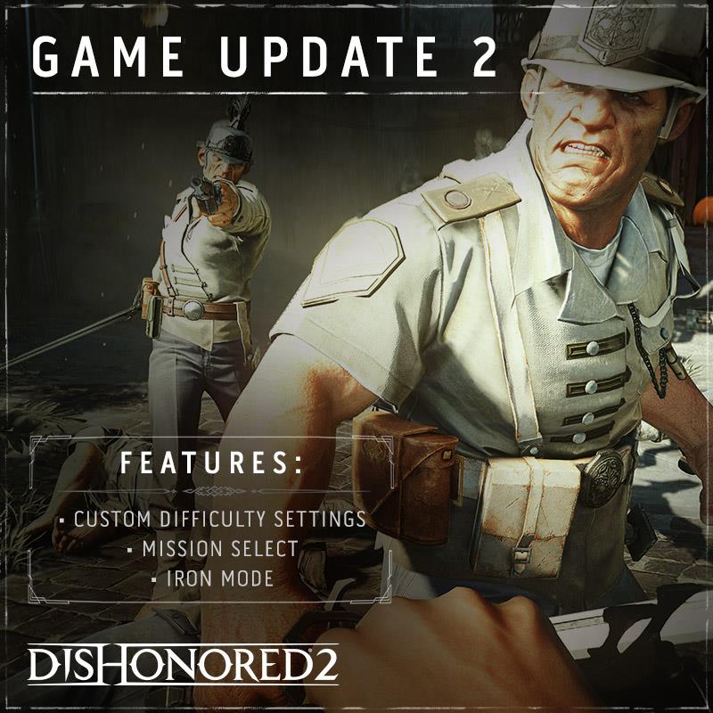 Dishonored 2’s second free game update with additional Custom Difficulty Settings and Mission Selectwill be available worldwide today for PC, Xbox One and PlayStation 4.