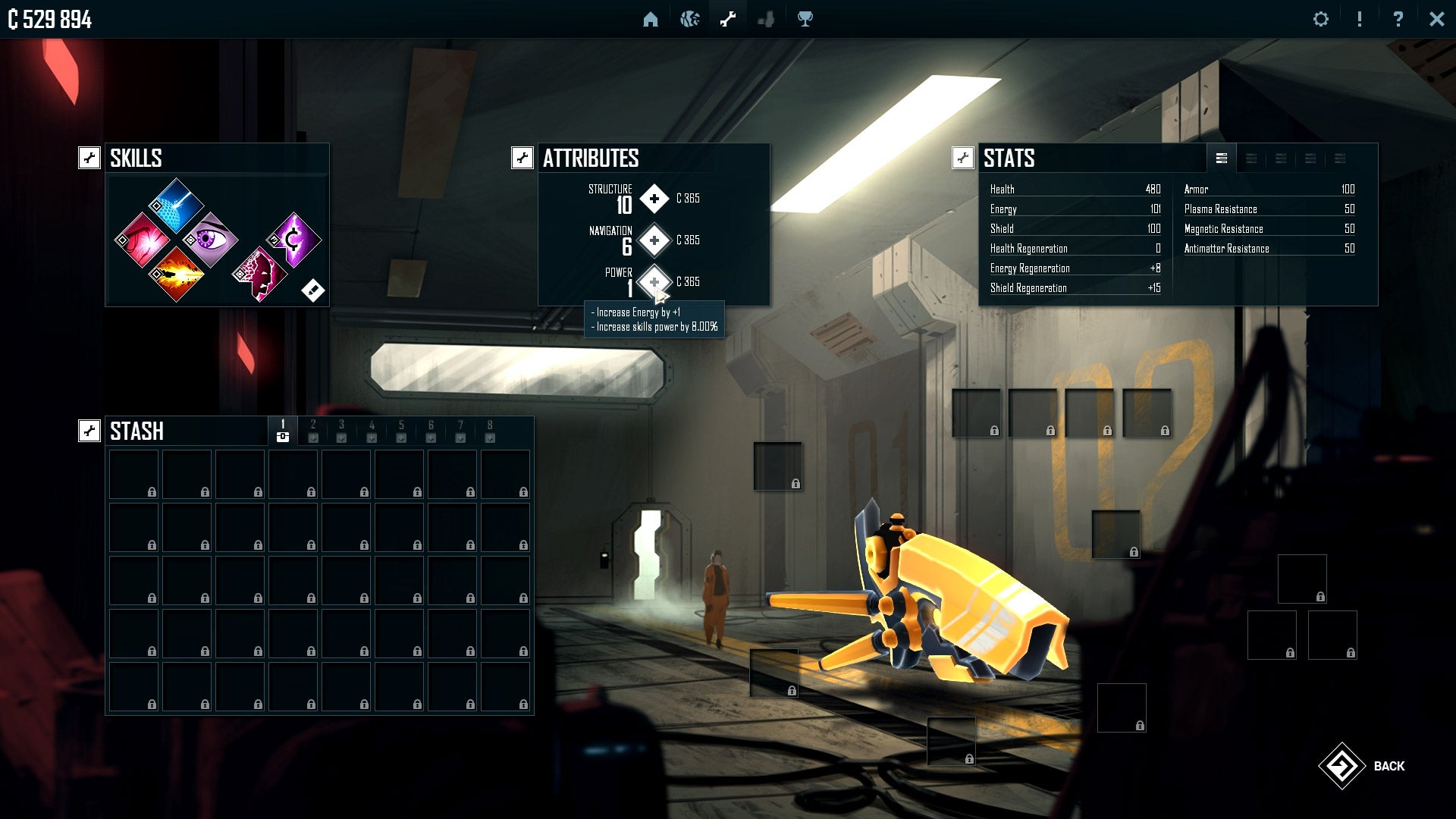 Something worth noting is the excellent and clean interface of Drifting Lands. Everything is perfectly legible, and easy to read from near and far, and is really crisp. While the gameplay is equally so, there are four meters that you must monitor at all times: Shield, Focus, Energy, and Health. In addition to that, there are four active skills which have a cooldown on them. The passives at least, are just that, passive – you don’t have to do anything with them. What does it all mean? Well, there’s a lot to keep up with in addition to the on-screen chaos. The passive abilities have an auto-retreat option (or one you can engage) manually. The actives can let you use energy to explode in area of effect damage, dash, or shoot energy beams to do massive damage on condensed areas. You can regain energy over time or recharging in areas that appear during the level.