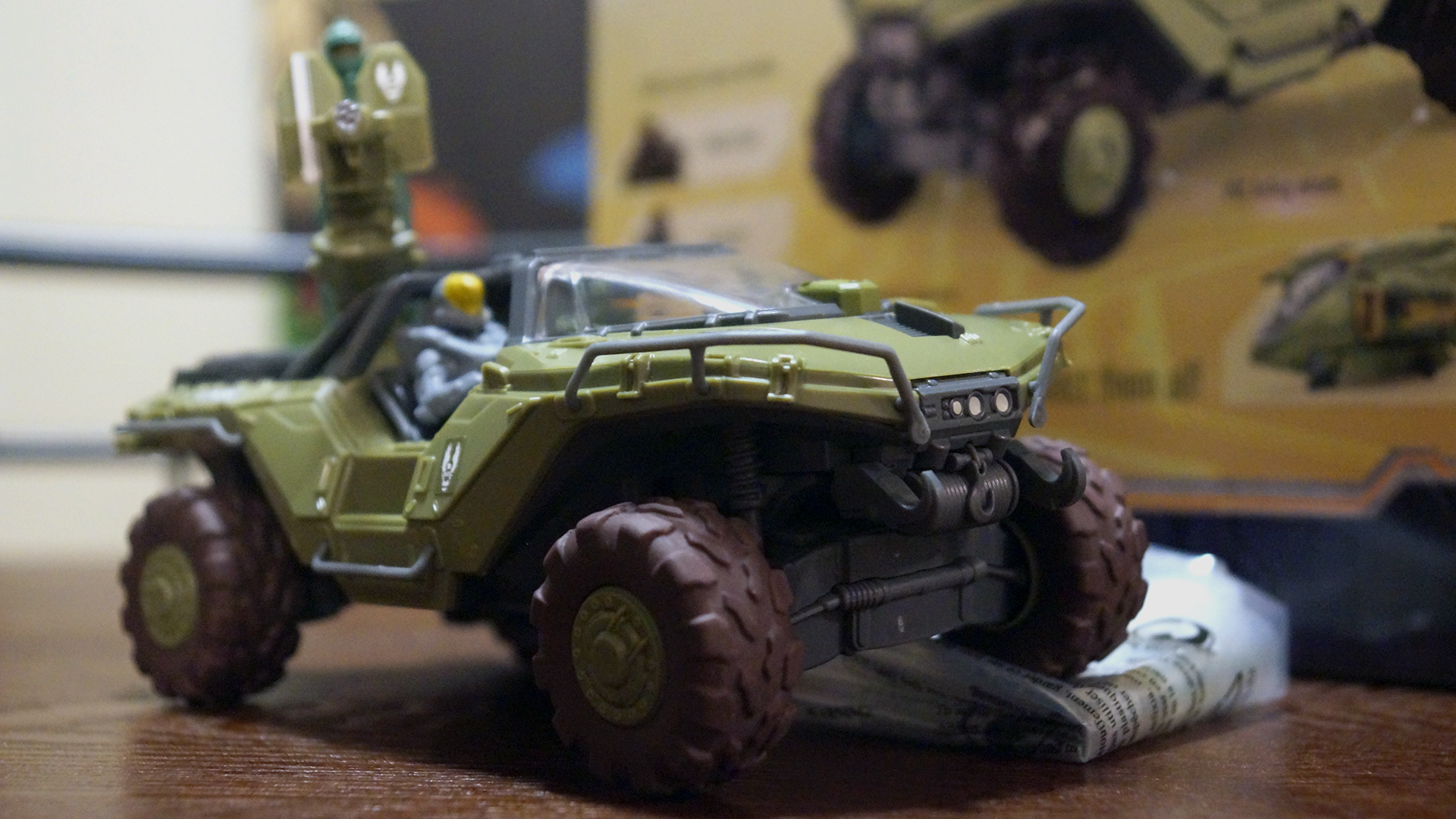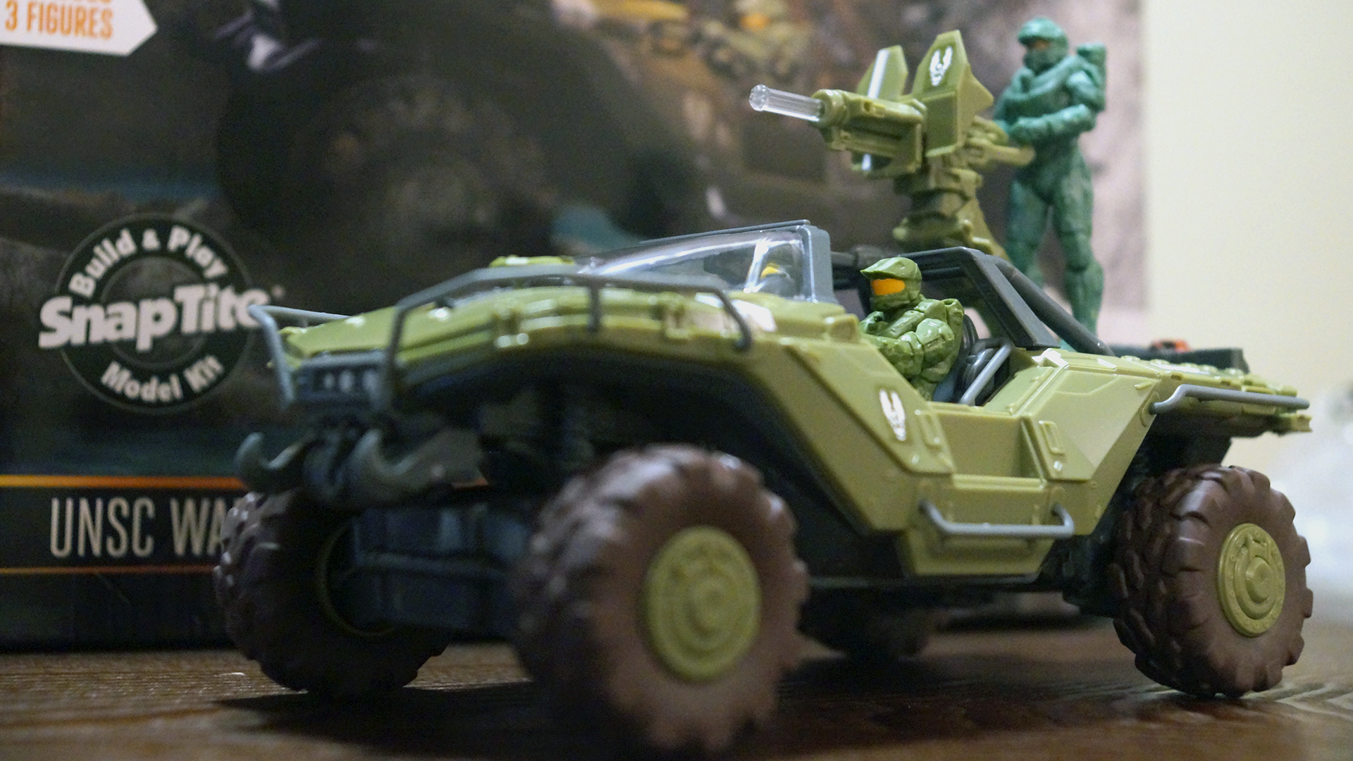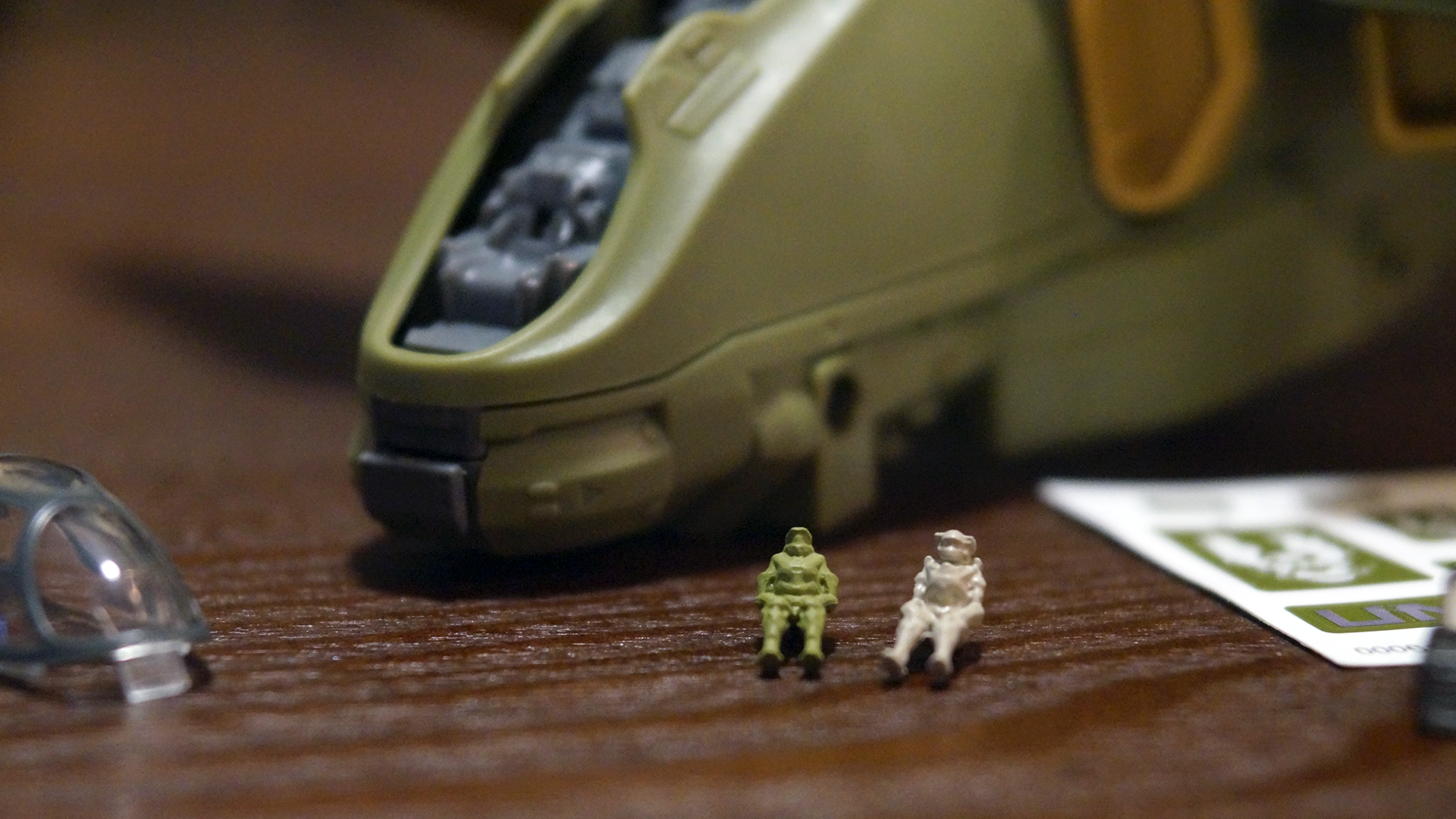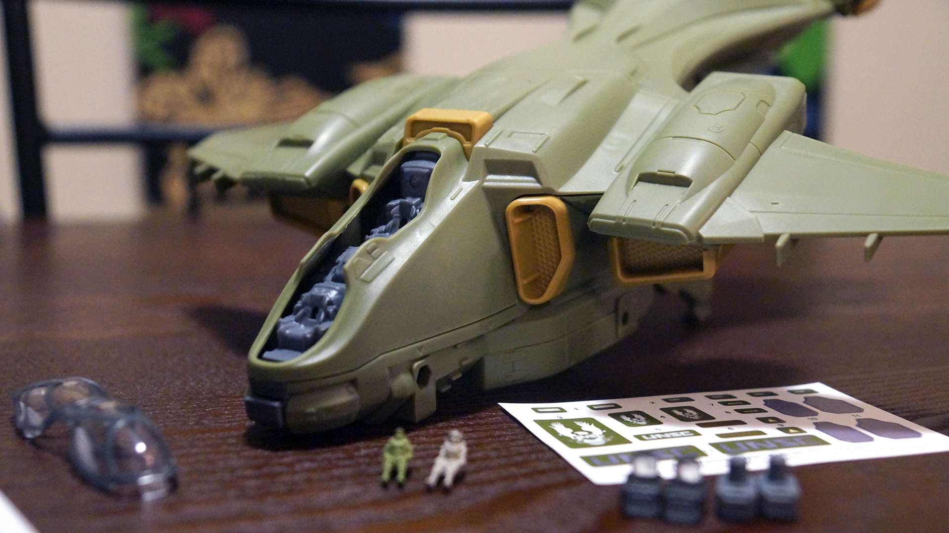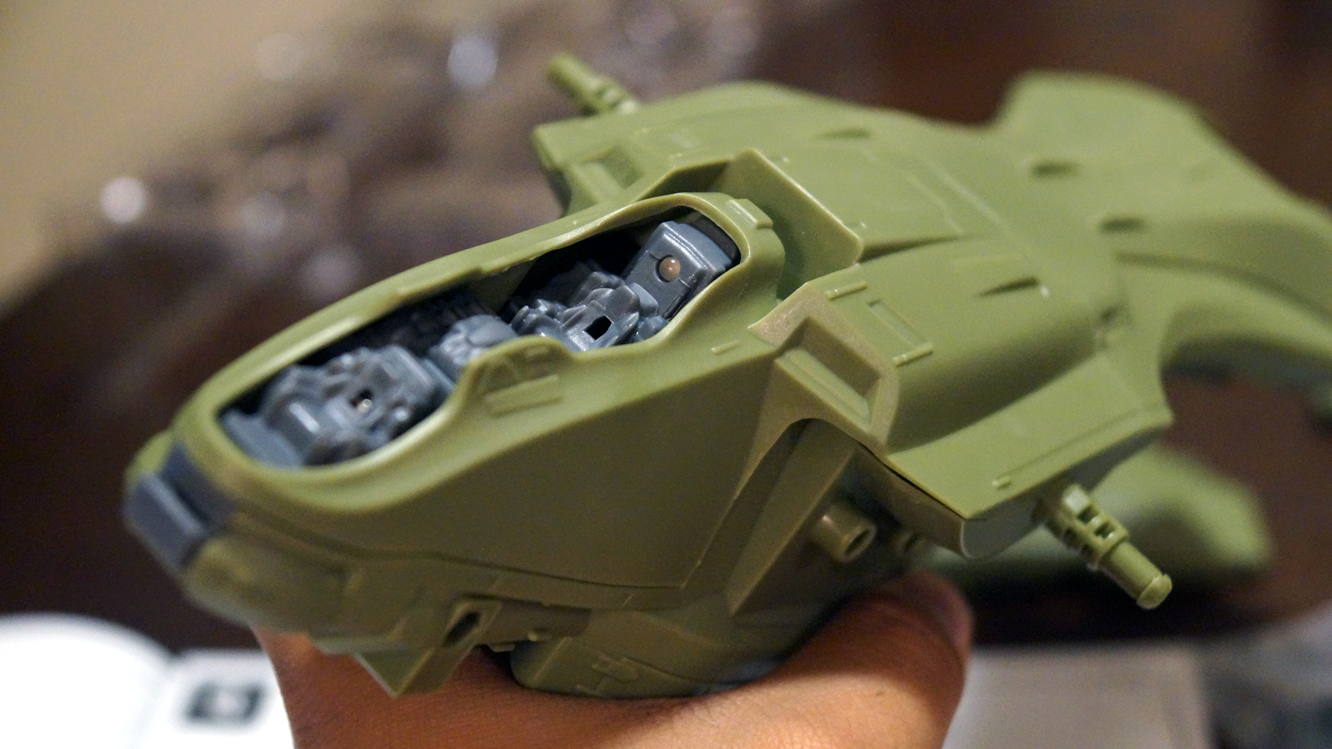 Both kits include Spartan figures to pilot the vehicles. The Warthog has a 3 inch Master Chief to drive, Kelly-087 in the passenger seat, and Frederick-104 manning the turret out back. The detail on the figures is very nice and the fit-and-finish keeps them in place well. I would have liked to see some more detail in the armor on the figures when it comes to colors and shading but being a SnapTite kit, it’s an ok detail to bypass. On the Pelican, they include a much smaller Chief and Linda-058. These two are about the size of a Tic-Tac, they’re tiny and easy to lose. Fortunately, they sit well in the cockpit of the Pelican.