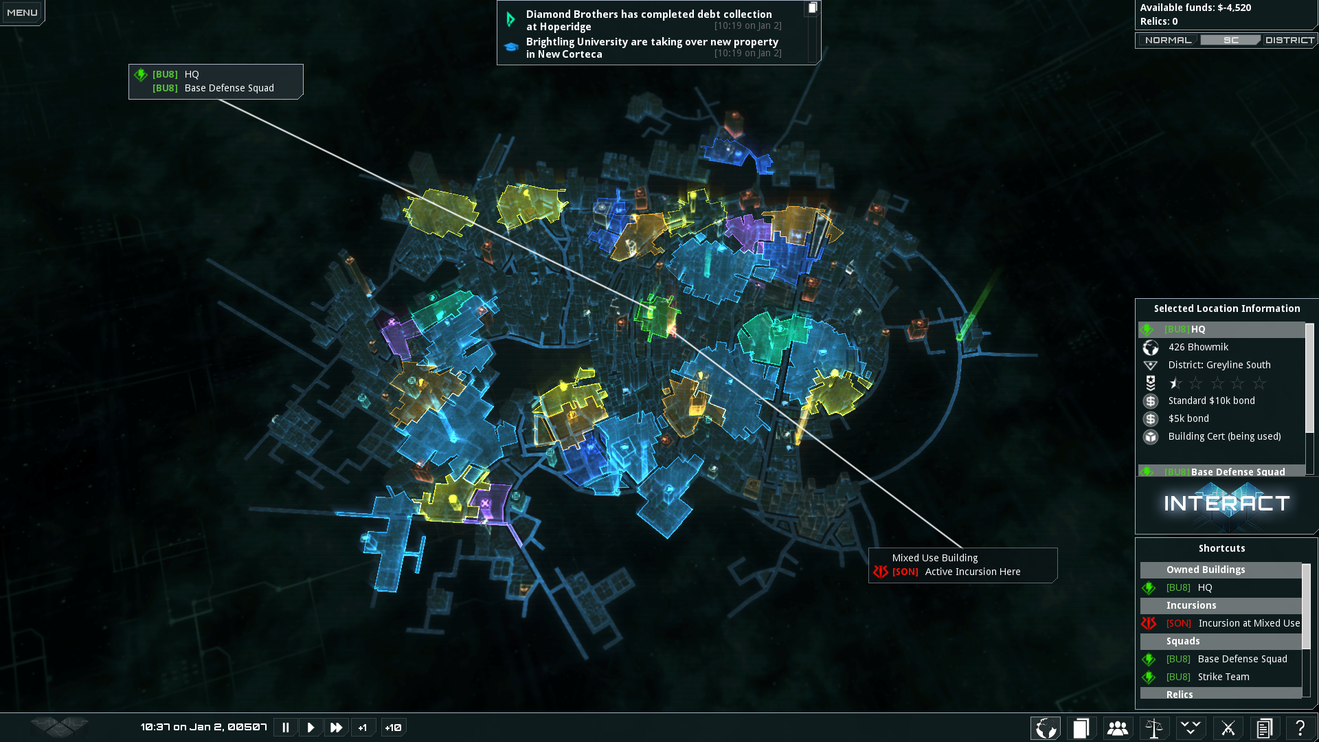 The biggest change to how Frozen Synapse works, is that there’s now a city map that serves as a hub area to have discussions with employers, track territorial control, and send your elite squad of clones on a never-ending series of missions. Each new game you begin breeds a procedurally generated version of the city. This city constantly feels like it is at the brink of chaos, and the city of Markov Geist gives Frozen Synapse 2 its sense of place that previously didn’t exist. The story is light, but your actions of first game are recognized categorically, not personally for the player. Frozen Synapse 2 seamlessly blends being a simultaneous turn-based tactics game in combat, and a strategy game for decisions made in the city view.