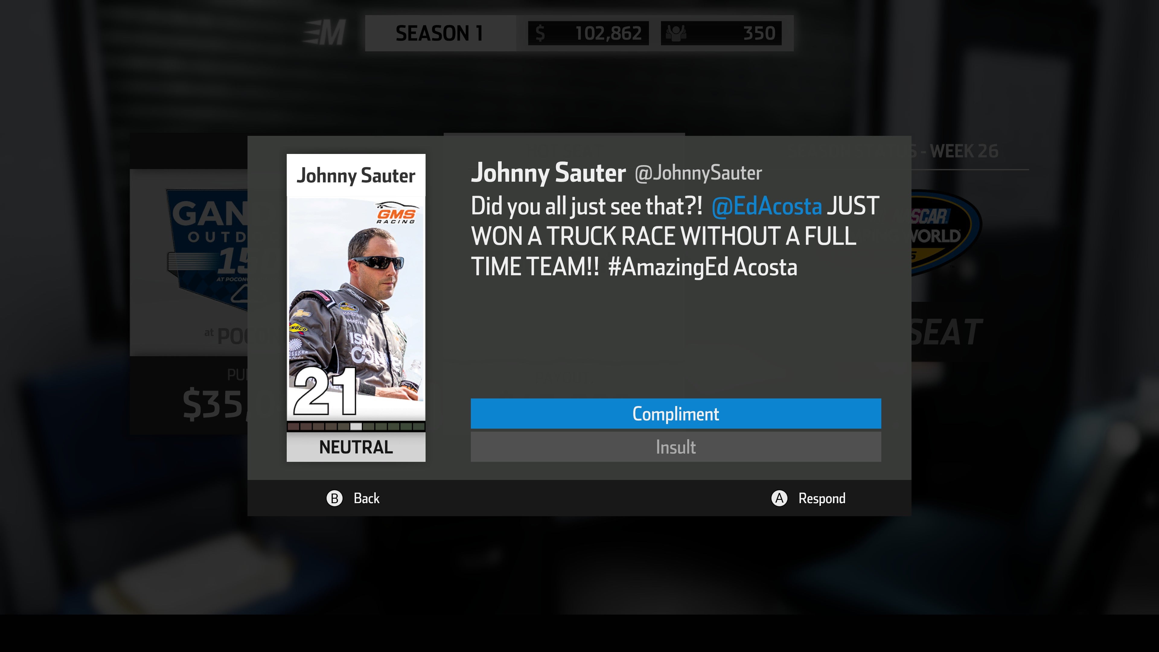 From there you choose from three sponsors. Each one offers different payout options and bonus options. In the dirt series, just go with whom pays out more. But if you’re in the three higher tiers (Truck, Xfinity, Cup) you have to pay attention to the manufacturer chosen as well. Prior to the patch, this information was hidden from the player. So I had chosen the sponsor with the best payout and got stuck with a Toyota truck. I drive Fords so this was problematic to me. I dug around in all the menus but there was no option for the player to switch their make of car. I was livid and honestly was going to write my review then. It wouldn’t have been well received if scored right then and there. Lucky I had noticed a patch was coming and waited. That first patch did reveal to the player the make of car tied to the sponsor. It was unfortunate that I had to re-race the whole dirt series just to be able to pick the car I wanted though.