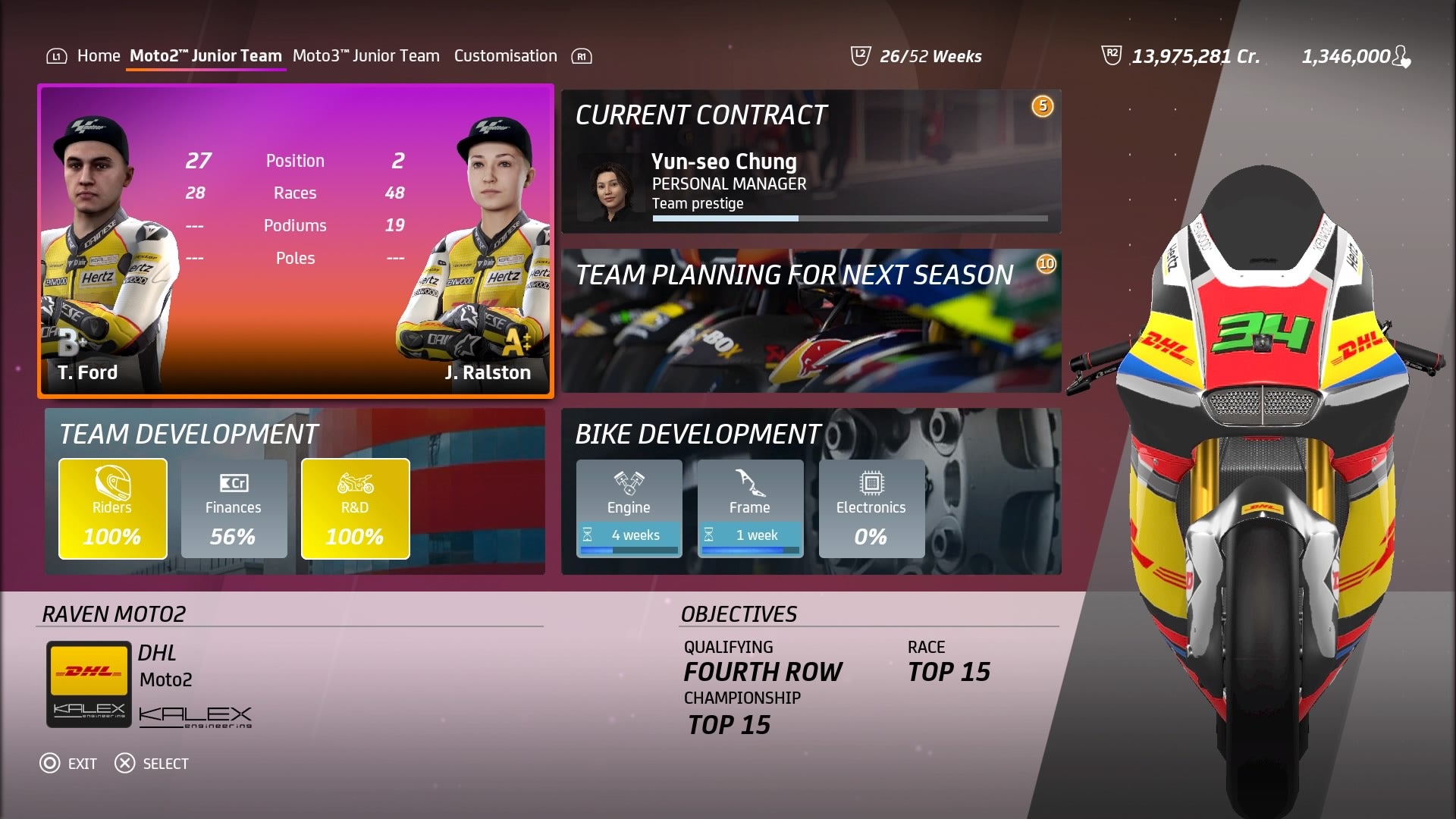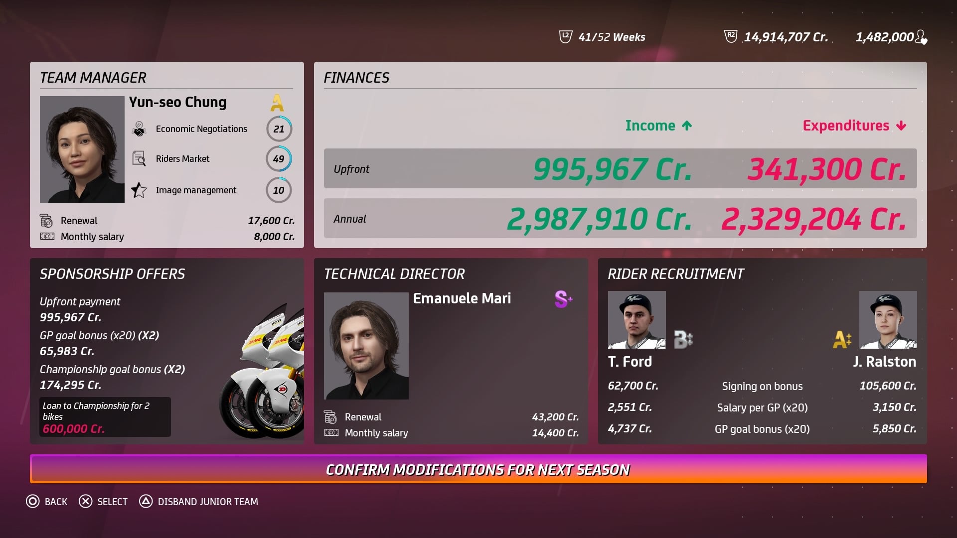 A team needs a Team Manager, whose skills will influence the ability to attract sponsors and to hire good riders. While the Technical Director, will influence bike development and on track performances during the weekend.