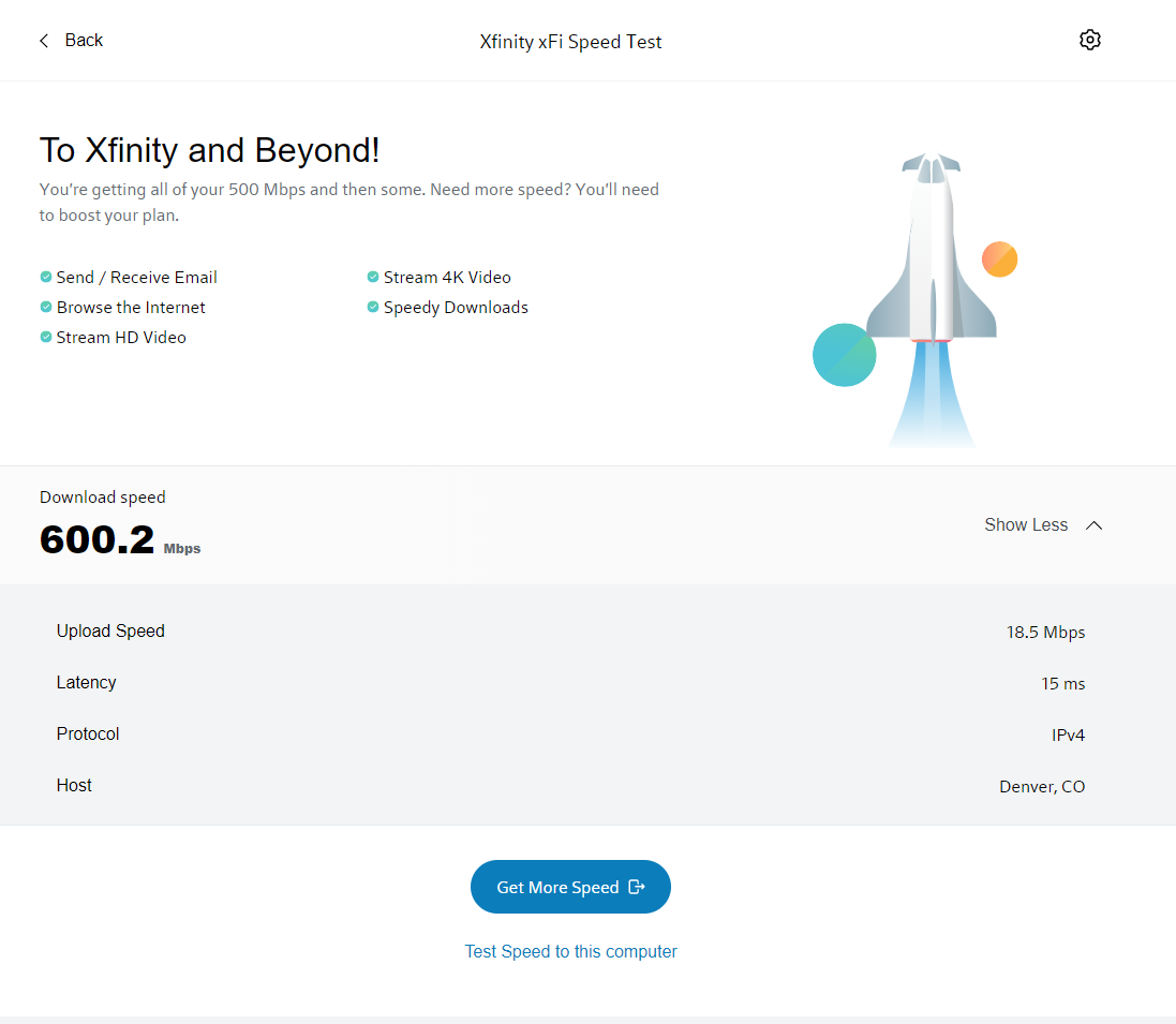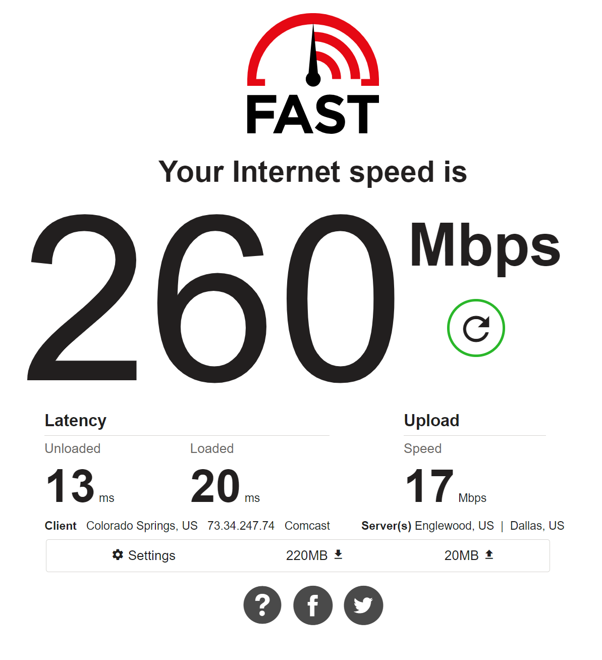 Speed Tests via Fast.com, Speedtest.net and Xfinity