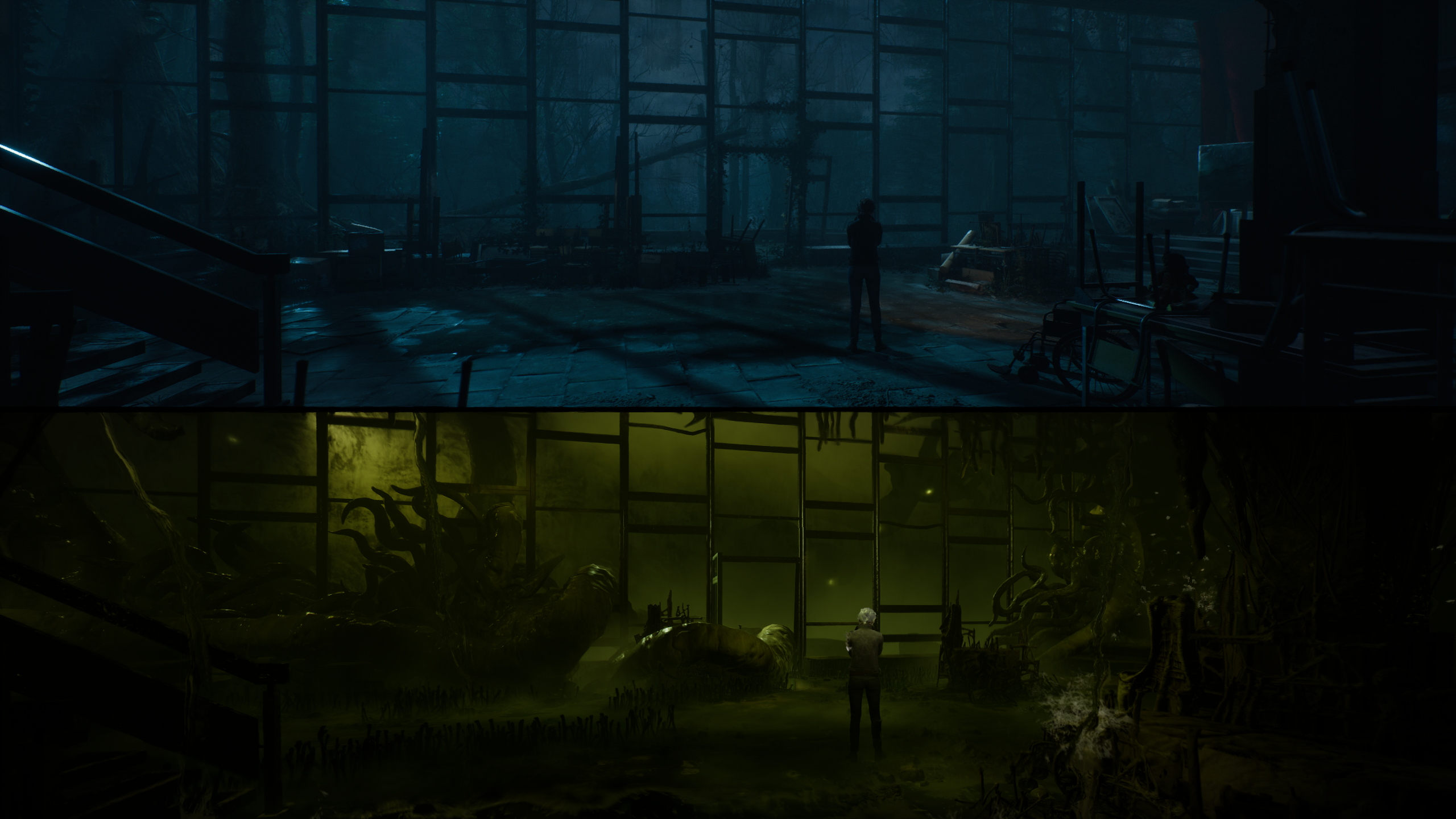 Marianne is gifted with the ability to see and communicate the Spirit Realm, an alternate version of our own reality where both the dead and echoes of the past linger. For most of her life, Marianne has merely glimpsed into the other side to help troubled souls pass on, but through the events of the game she embarks on a journey that unlocks more of her abilities, and requires her to use her intuition and intelligence to overcome obstacles and solve problems in both the Material and Spirit worlds alike. The Spirit World is a bizarre counterpart to the Material World; locations are the same, but varying degrees of organic-looking growth overtake familiar surroundings, so that a desk will often appear covered in (or made of) unknown fungal spores, or entire walls will be made of pulsing tree roots, with everything bathed in a single hue that acts as an emotional grounding for the scene. In the beginning of the game, the Spirit World is dominated by warm orange and brown tones, but in further locations things shift to murky browns, melancholy blues and sickly greens.