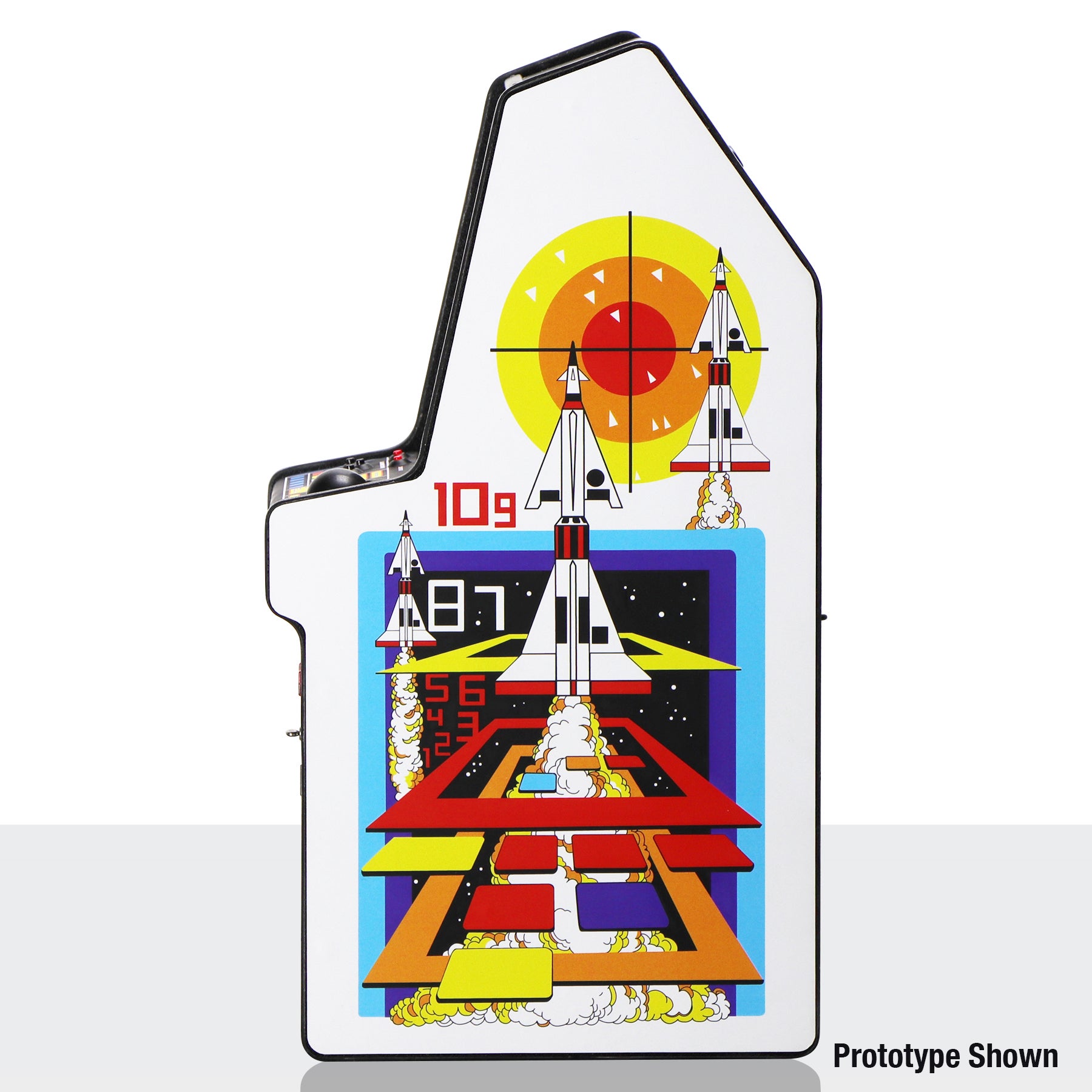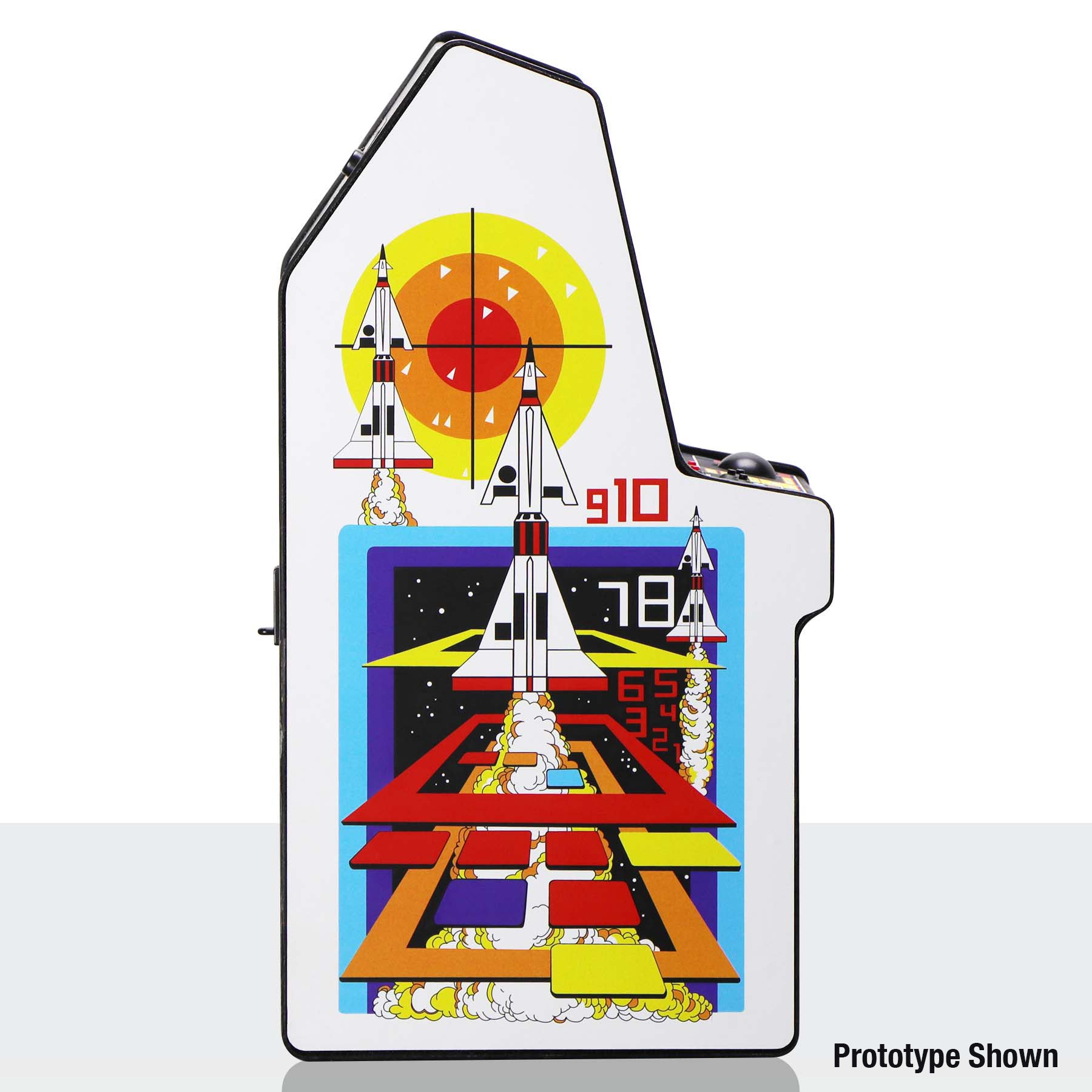 Missile Command X RepliCade Standard Edition is a faithful recreation of the 1980 arcade original, featuring a Trak-Ball interface, illuminated Volcano-style buttons, and striking cabinet art. A unique CRT FX lens transforms the built-in LCD to look like a CRT display from the era — scanlines and all.