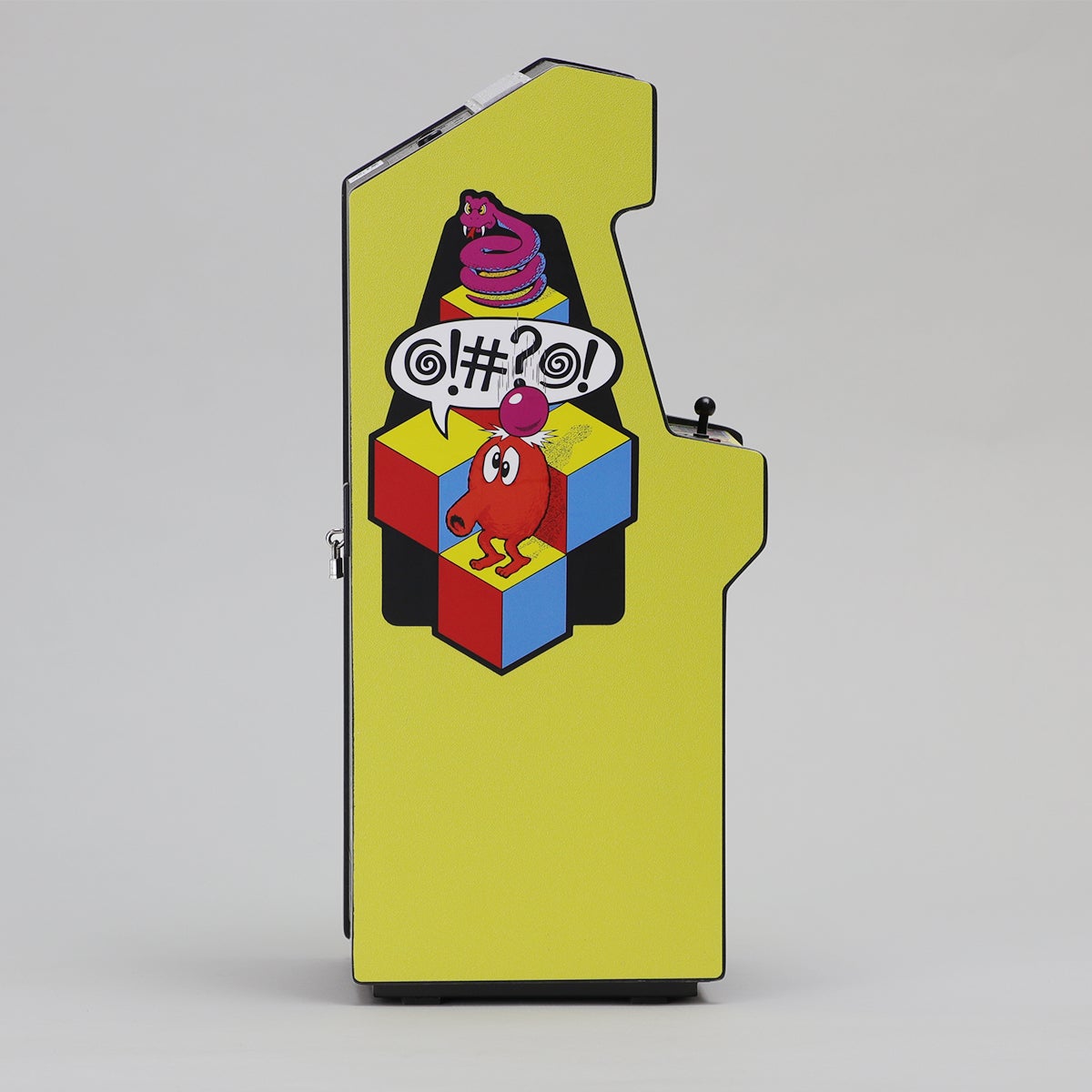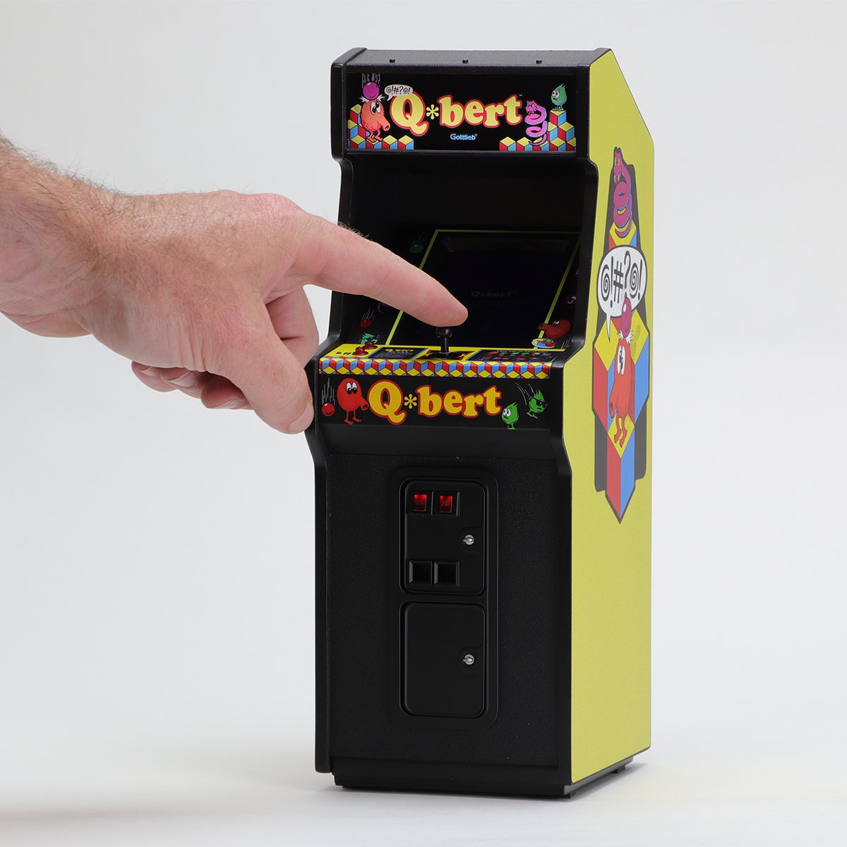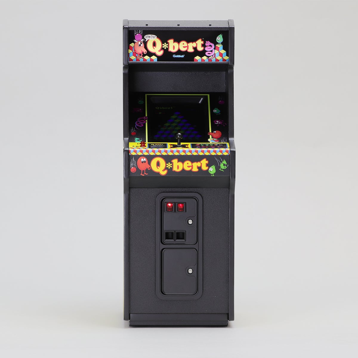 The Q*bert x RepliCade Standard Edition is 1/6-scale, fully playable replica of the classic Q*bert arcade cabinets. Modeled after the classic yellow Q*bert cabinets traditionally seen in arcades, Q*bert x RepliCade includes both the original game and the previously unreleased Q*bert sequel, Faster Harder More Challenging Q*bert. It is outfitted with meticulously developed details such as the fully functional knocker coil that thumps when Q*bert falls, a diagonally mounted four-way joystick, and miniaturized control panel buttons.