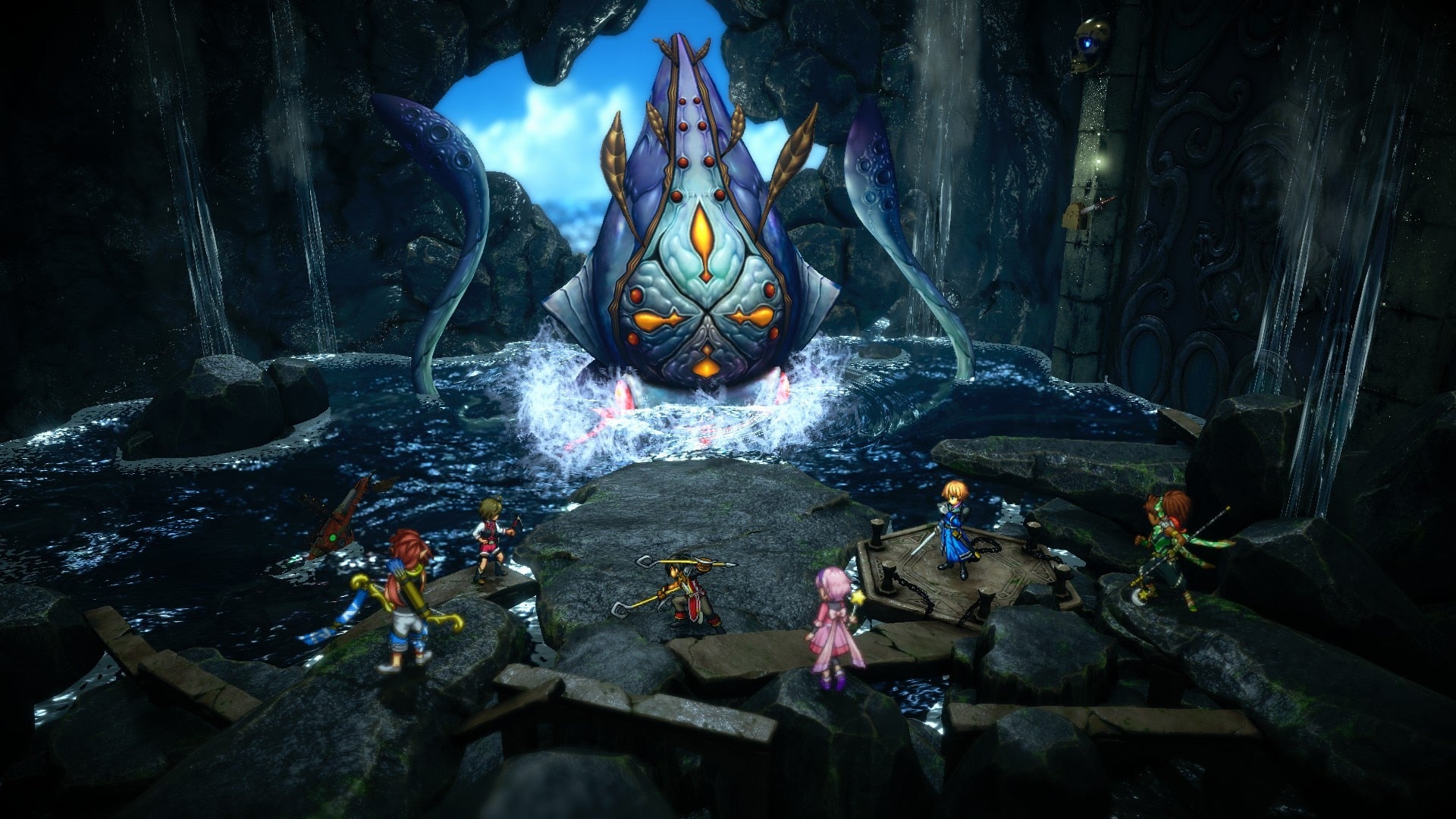 By reasonable I mean, get ready for sprawling dungeons midway through the game that are both aesthetically beautiful as they are complex to navigate. Even the most linear ones will have some sort of puzzle or hidden shortcut that you will have to figure it out in order to progress. Outside one early in the game that tested my patience with some obnoxious design, Eiyuden Chronicle: Hundred Heroes more than makes up for it with good rewards and amazing boss battles. Again, if you are looking for something that is as in depth as the early Shin Megami Tensei or a typical Dungeon Crawler, you are in the wrong spot.