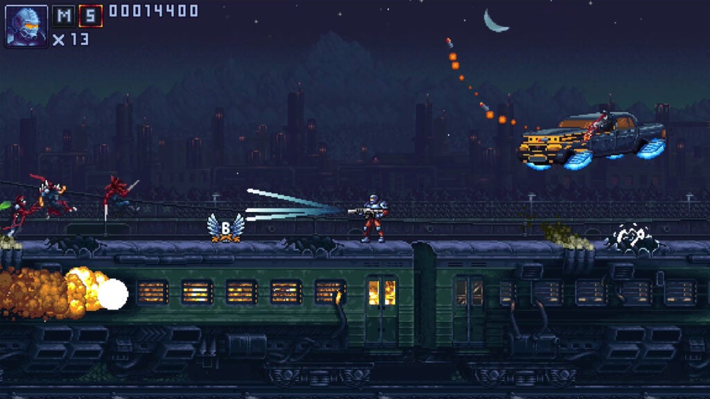There are nine levels to Iron Meat, each with their own personality. The first level is The Forest, a solid introduction to the mechanics and the flow of levels and bosses, which are all multi-phased. Sky is a flying ship level, with precarious traps and drops. On Train, there are a lot of traps whether it be gaps or exposed electrical wires, this will mean instant death. It gets annoying, and can be easy to miss, even with the art being clean and clear. Skyscraper puts you in a slowly rising elevator with a tighter camera as enemies drop and fly in. Moon is a short level with an easy boss. Moon Base has a great nod to Teenage Mutant Ninja Turtles: The Arcade Game in its opening moments. City has the attitude of alternate 1985 Hill Valley where Biff Tannen is running things, but here is taken over bio-organic beings. As far as final bosses go, Iron Meat has a really good one, though the game leaves you wanting more.