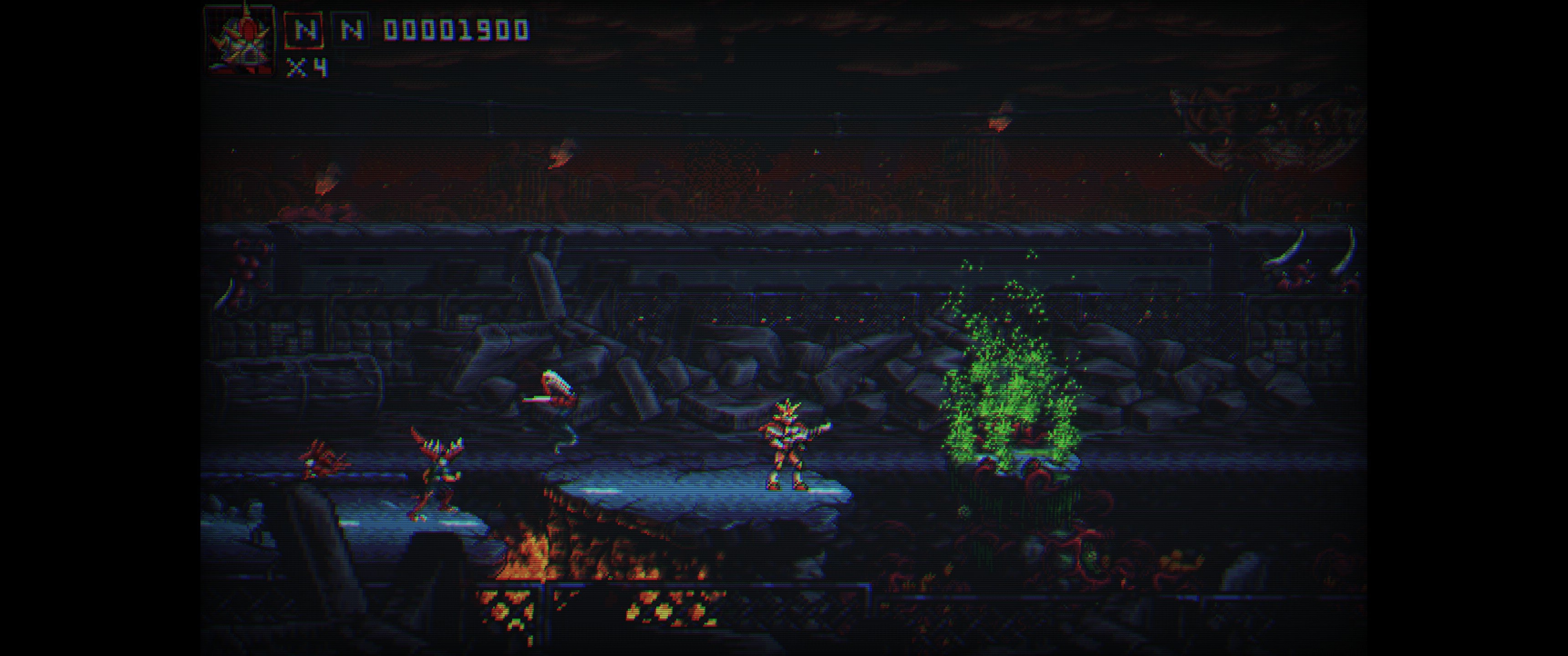 Enemies mostly consist of taken over humans who are no longer human, and must be put down. There will often be little grubs you have to dispatch, requiring you to get low or jumping over them entirely. Due to the bio-organic nature of these extraterrestrials, they have also taken over machines and inanimate objects, and made them bio-mechanical and more deadly. Much like the levels of the game, bosses have lots of unique personalities and designs. Each boss is multi-phase, and you’ll fight things like an attack helicopter melded with a crocodile. Or you’ll do battle with a mutated scorpion, or perhaps a biological-infused tank. With everything you’ll blow parts off of it, exposing an body parts or an eye you shoot. It’s all a horror to look at, but you can’t help but stare.