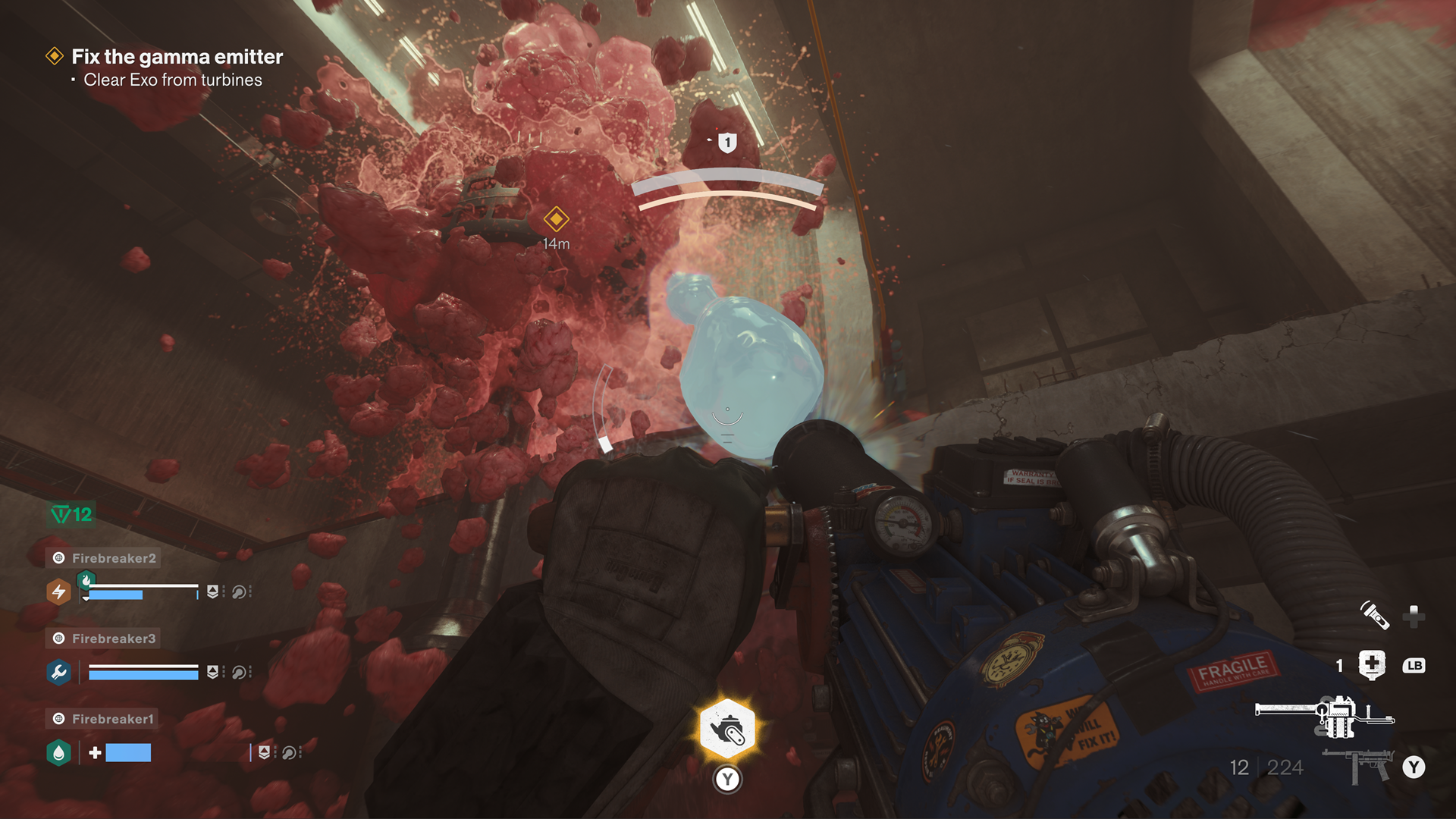 Surprisingly, there are only five jobs to embark on in FBC: Firebreak. On Normal difficulty at going through each of the three zones, takes about 25-30 minutes per job to complete. The first job, Hot Fix has you dodging scalding hot flames and disposing of materials in a confusing game of “what does the game want me to do?”. Paper Chase is my personal favorite, as it has you destroying thousands and thousands of nefarious yellow sticky notes. It provides levity and that Control flavor I mentioned earlier, and find the ways to dispose of them in massive quantities is key to its success. This job culminates in a boss battle with a massive sticky note monster that’s a chore to fight. Next is Ground Control, taking place in the Quarry, offers a respite from the brutalist architecture of the Oldest House. Here you’re tasked with collecting radioactive material and bringing them to a cart, and moving said cart like Overwatch or Team Fortress 2. Then there’s Frequency Shift, which has you battling too many hiss, and pink goo that grows back at too fast a rate to get through. It’s a frustrating level that slows you down to no enjoyment. Lastly, there’s Freezer Duty which has you battling the element of cold, and while I don’t dislike it, it isn’t memorable.